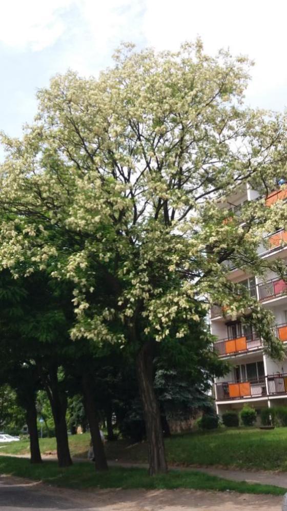 Robinia akacjowa, inaczej grochodrzew lub robinia biała (Robinia pseudoacacia L.), to gatunek drzewa należącego do rodziny bobowatych. Pochodzi z Appalachów w Ameryce Północnej. W Polsce zrobiła szybko karierę, bo różni się od rodzimych drzew, dobrze rośnie na ubogich glebach. Wpierw była podziwianą ozdobą parków, ogrodów wiejskich, coraz bardziej traktowana po swojsku. I to mimo, że jest gatunkiem obcym, który bardzo szybko się rozrasta i kolonizuje teren. Tworzy podziemne odrosty, w ciągu kilku lat mogą opanować całą okolicę. Walka z nimi jest trudna, jeśli wytniemy matczyne drzewo, z korzeni wyrastają nowe …